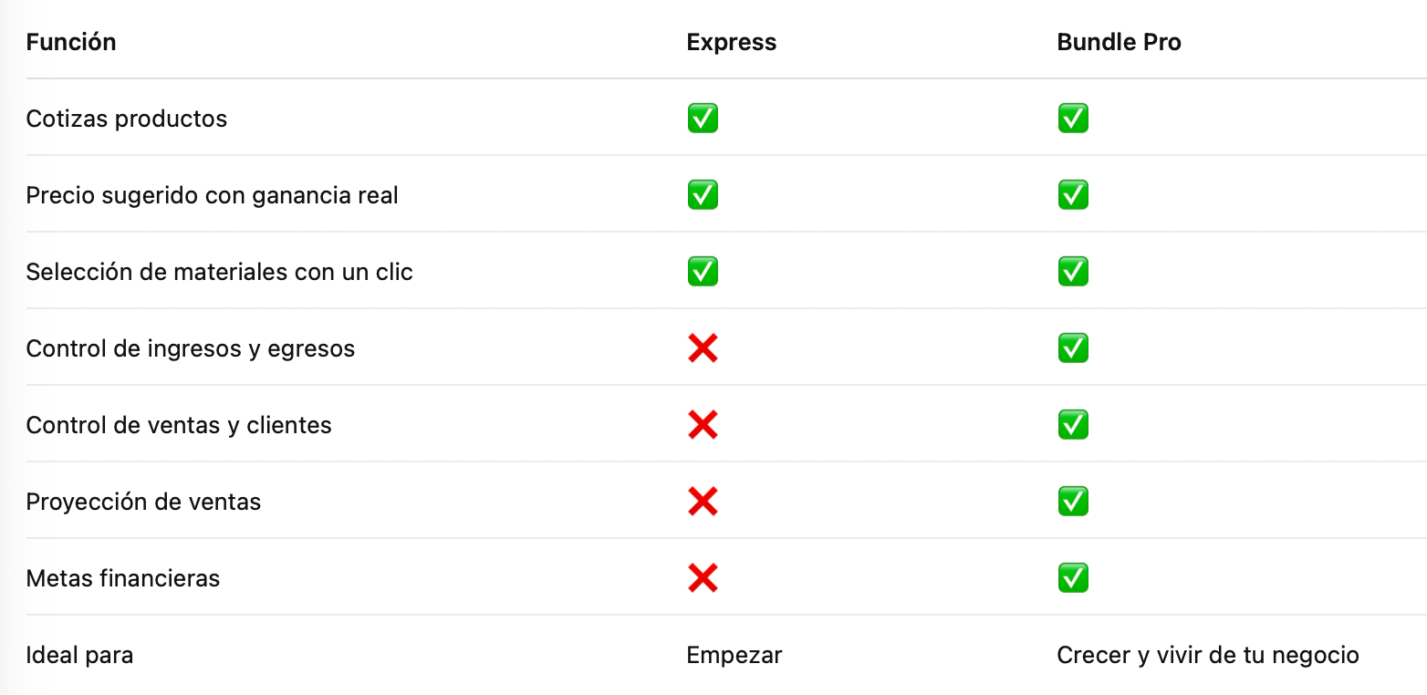 El Bundle Pro incluye:✨ La Calculadora Mágica Express para cotizar bien y cobrar lo que vale tu trabajo.➕ 2 herramientas estratégicas para crecer sin caos:💸 Controlas tus ingresos y egresos y sabes si realmente estás ganando.🧾 Registras ventas, pedidos y clientes en un solo lugar.🎯 Proyectas tus ventas y defines metas financieras claras y alcanzables.