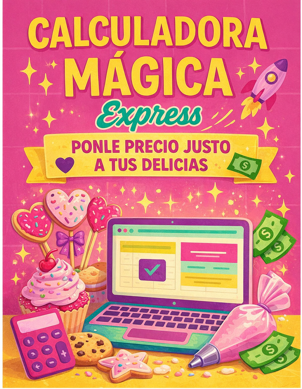 La Calculadora Mágica Express Repostería te ayuda a poner precios correctos para pasteles, galletas, cupcakes, postres y mesas de dulces, sin adivinar y sin miedo.